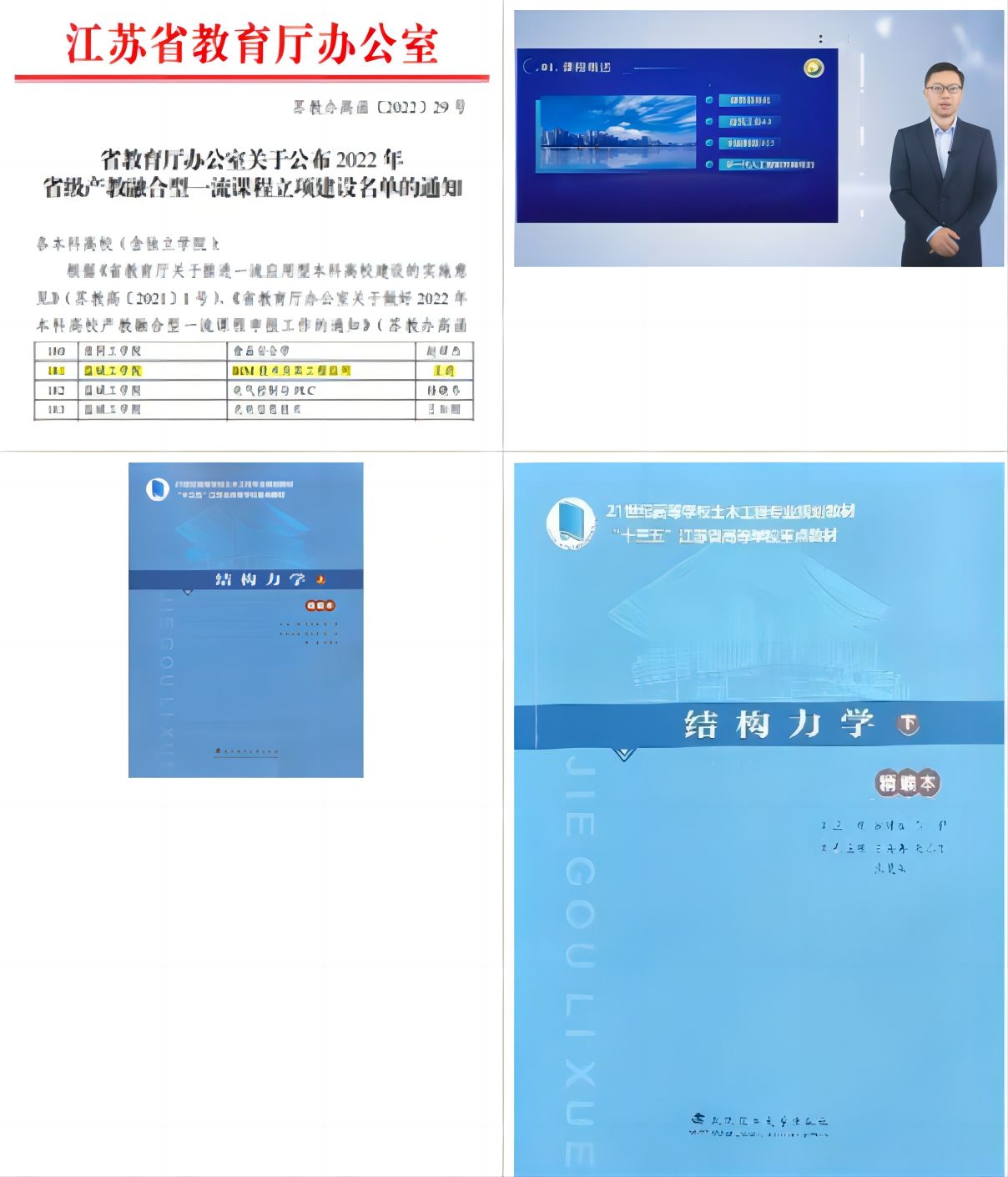 学院高度重视课程与教材建设工作,现有国家级一流本科课程3门,江苏省一流课程4门,江苏省课程思政示范课程1门,校级课程30余门。近年来,学院出版教材20余部,其中,江苏省重点教材8部,住建部规划教材7部,省优秀培育教材和省职业教育规划教材各1部。
